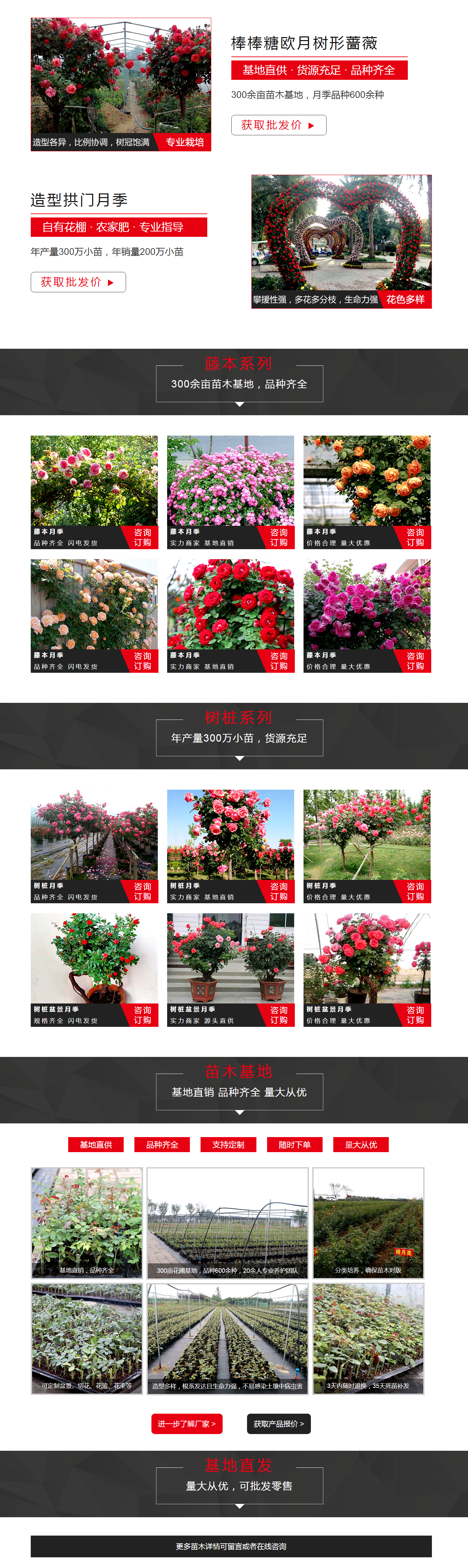 主营产品:月季花苗木,藤本月季花,树桩月季花,灌木月季花