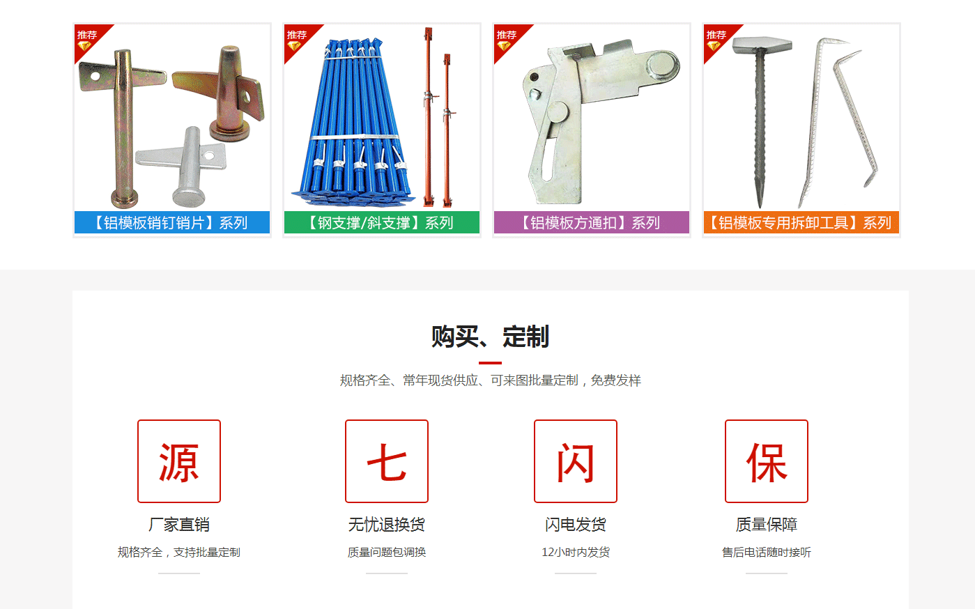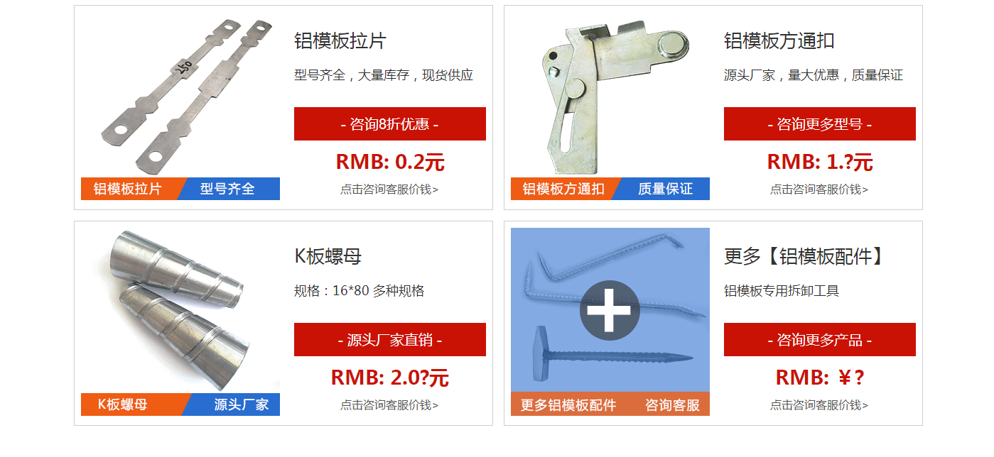 主营产品:铝模板销钉,销片,钢支撑,拉片,对拉螺杆,方通扣,K板螺丝,铝模板配件